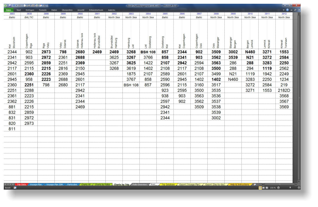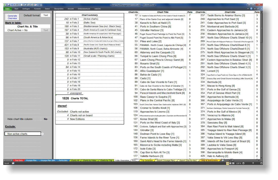 Axcel ChartManagement findet seine Anwendung an Bord von Seeschiffen. In diesem Excel-Programm können Routendaten abgespeichert und leicht wiedergefunden werden. Ebenfalls bietet es eine komfortable Verwaltung der an bord befindlichen Seekarten. Das Programm verknüpft beide Elemente und bietet die Möglichkeit, diese Informationen in ein in Excel eingebettetes Voyage Planning Form (Formblatt zur Routenplanung) per Knopfdruck einzufüllen. Insbesondere bei fast täglichen Routen und dichter Hafenfolge kann so viel Zeit erspart werden. Insbesondere dann, wenn Routen wiederholt gefahren werden und einige Informationen (wie Gesamtdistanz, Revierzeiten und Revierdistanzen, Funkfrequenzen, Nautische Publikationen etc.) wiederverwendet werden können. Intuitive Bedienbarkeit Die Kartenverwaltung besteht aus zwei Tabellenblättern: “Charts all” und “Charts by Folios”. Beide Tabellenblätter arbeiten zusammen, d.h. in einem Tabellenblatt vorgenommene Änderungen werden in das jeweils andere Tabellenblatt übernommen. Insgesamt stehen 20 sog. “Folios” (=Gruppen) zur Verfügung. Jede Karte kann flexibel in einen dieser Folios eingeordnet werden, die thematisch eine logische Gruppe darstellen können (z.B. eine Gruppe für ein bestimmtes Fahrtgebiet oder eine Gruppe entspricht der Schublade des Kartentisches auf der Brücke). Alle Karten können mit einem Datum des an Bord kommens und des von Vord gehens versehen werden. Die in der Routendatenbank für eine Route hinterlegten Seekarten werden bei Laden der Route per Formel mit dem Kartenbestand in der Inventurliste verglichen und der Status sogleich farblich markiert. .