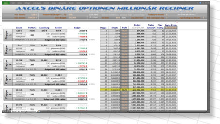 In vielen Spam-Mails wird wie Martingale-Methode in Online-Casinos als Geheimtipp angepriesen um damit richtig viel Geld zu verdienen. Ich habe dazu einen Martingale-Simulator in Excel gebaut um dieser Methode der Einkommensquelle etwas näher zu beleuchten. Das Ergebnis eines jeden Durchlaufs wird sehr anschaulich in einer Grafik angezeigt und ist ernüchternd…Nach Benutzervorgaben simuliert der Axcel Martingale Simulator durch einen Zufallsgenerator eine gewünschte Anzahl an Roulette-Spielen. Dabei wird der Einsatz nach jedem verlorenen Spiel gemäß der Martingale-Strategie verdoppelt. Der Benutzer kann für die Simulation eine maximale Verlustserie festlegen, bis zu der verdoppelt wird. Außerdem können einige Strategie-Variante ausprobiert werden: a) nach einer bestimmten Verlustserie den Einsatz beibehalten, statt ihn zu verdoppeln oder wieder mit dem kleinsten Einsatz beginnen.b) nach einer bestimmten Verlustserie auf etwas anderes setzen (z.B. von schwarz auf rot) und damit auf das Anhalten der aktuellen Serie spekulieren.c) Wenn der Einsatz das Budget überschreitet, ob man das restliche Budget riskieren oder wieder mit dem Mindesteinsatz beginnen möchte.Binäre Optionen Millionär RechnerEine ebenfalls lukrative Geldquelle soll der Handel mit Binären Optionen sein. Im Netz findet man dazu eine große Fülle von kostenpflichtigen Angeboten mit vielen Versprechungen. Ich habe eine Excel-Datei erstellt, in der man unter Vorgabe bestimmter Rahmenbedingungen (durchschnittlicher Profit pro gewonnenem Trade, erwartete Gewinnrate, Einsatz pro Trade etc.) errechnen lassen kanna) wieviel Trades man tätigen muß, bis das Start-Budget einen vorgegebenes Etappenziel erreicht hat (z.B. Verdopplung).b) nach wieviel Trades bzw. Etappen die Millionengrenze geknackt wird (durch Kombination verschiedener Etappen bei denen die Einsätze dynamisch gesteigert werden)c) wie lange das unter bestimmten Annahmen (Trades pro Stunde, Stunden pro Tag und Tage pro Woche) dauern wird.Durch Ausprobieren verschiedener Ausgangsparameter kann man sich somit selbst einen Eindruck manchen, wie leicht / schwer es werden wird durch Handel mit Binären Optionen zum Millionär zu werden. .